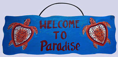 SIGN DECORATION TURTLE WELCOME TO PARADISE CARVING FROM ABESIA WOOD